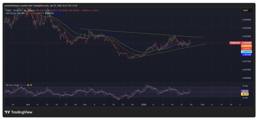 Pada 25 Januari, Pump.fun sempat menemukan dukungan di kisaran $0,0024, yang menunjukkan bahwa pembeli mulai masuk di harga rendah. Pada saat itu, harga PUMP sempat berada di sekitar $0,0026, naik lebih dari 5,2% dalam 24 jam.