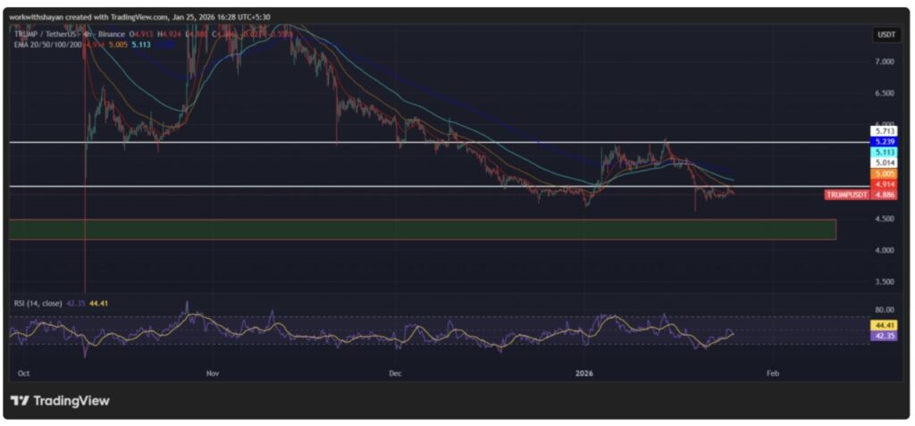 Penurunan tajam pada hari Senin yang diikuti penutupan di bawah EMA 20-hari mengindikasikan bahwa pasangan TRUMP/USDT mungkin telah mencapai puncak jangka pendek. Jika tekanan lemah ini berlanjut, harga bisa mengalami koreksi penuh dan turun ke kisaran $4,4 hingga $4,1.