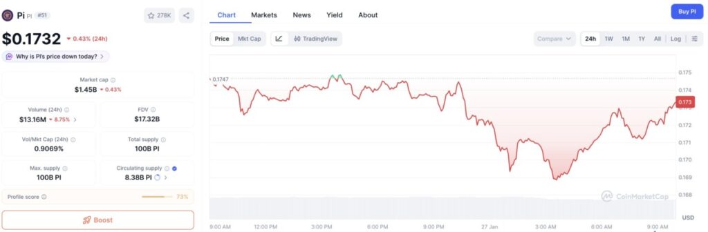 Pada 27 Januari 2026, harga token Pi (PI) terpantau mengalami penurunan tipis sebesar 0,43% dalam 24 jam terakhir, diperdagangkan di kisaran $0,1732. Meski koreksi ini tergolong kecil, hal tersebut terjadi di tengah menurunnya aktivitas pasar, tercermin dari volume perdagangan harian yang turun 8,75% menjadi $13,16 juta.