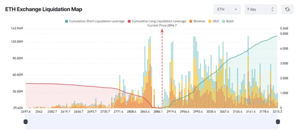 Peta likuidasi 7 hari untuk Ethereum menunjukkan ketidakseimbangan yang signifikan antara potensi likuidasi kumulatif dari posisi short dan long. Secara khusus, jika ETH pulih ke angka $3.200 pekan ini, para penjual short bisa mengalami kerugian likuidasi yang melebihi $4,8 miliar.