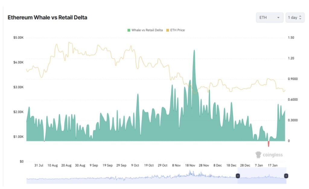 Ada alasan jelas bagi para trader untuk berhati-hati. Analis CW, dengan menggunakan data Ethereum Whale vs. Retail Delta, menunjukkan bahwa para whale telah kembali menguasai ETH dalam sepekan terakhir. Metode ini telah berubah dari negatif ke positif dan terus meningkat tajam.