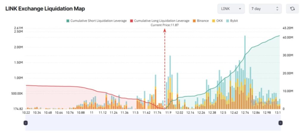 Akibatnya, para trader ini akan menanggung kerugian yang lebih besar jika LINK mengalami pemulihan. Jika LINK naik kembali ke angka $13 pekan ini, total potensi likuidasi kumulatif dari posisi short bisa melebihi $40 juta.