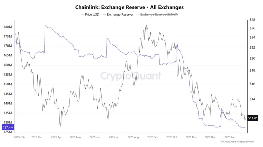 Sementara itu, data dari bursa menunjukkan bahwa cadangan LINK mencapai titik terendah bulanan baru pada Januari, menurut CryptoQuant. Grafik menunjukkan bahwa meskipun harga mengalami penurunan, investor tetap mengakumulasi LINK dan menariknya dari bursa. Perilaku ini mencerminkan kepercayaan jangka panjang terhadap aset tersebut.