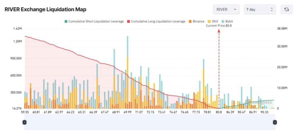 Jika harga RIVER bergerak di luar ekspektasi dan turun di bawah $60 pekan ini, posisi long bisa mengalami kerugian likuidasi hingga $35 juta.