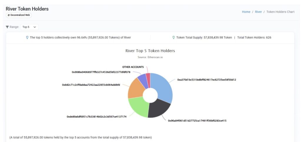 Apakah skenario ini mungkin terjadi? Data on-chain memberikan beberapa sinyal peringatan. Data dari Etherscan menunjukkan bahwa lima dompet teratas RIVER menguasai lebih dari 96,6% dari total suplai, yang menandakan konsentrasi kepemilikan yang sangat tinggi.