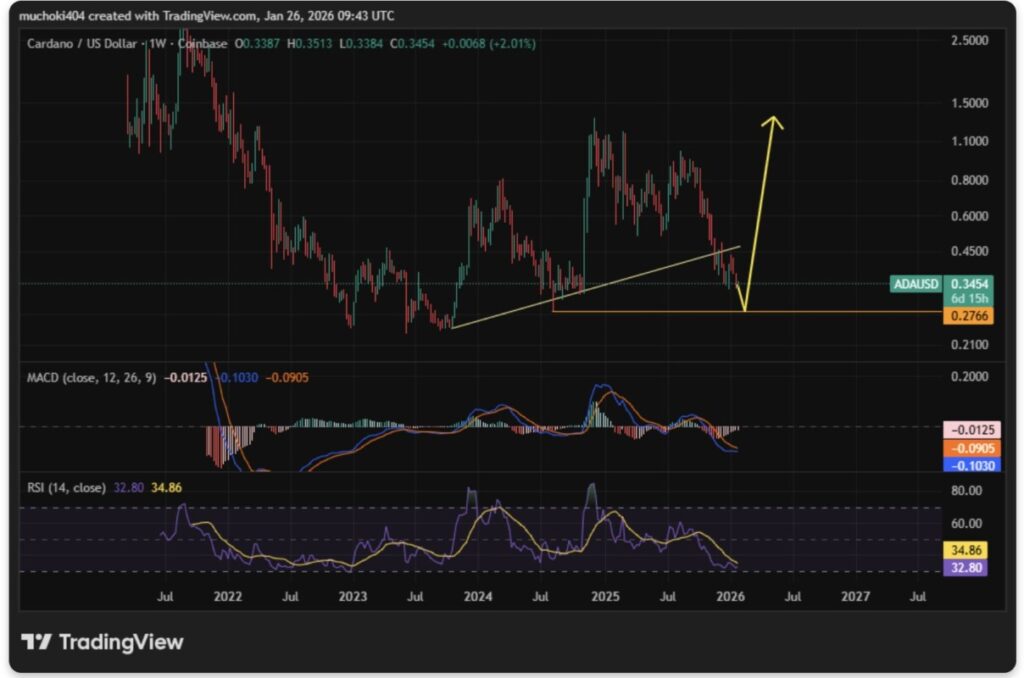 Secara teknikal, pasangan ADA/USD menunjukkan tekanan bearish jangka menengah, dengan target penurunan menuju sekitar $0,27 sebelum kemungkinan pemulihan harga.