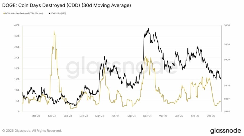 Selain itu, metrik Coin Days Destroyed (CDD) menunjukkan bahwa kapitulasi dari para pemegang kemungkinan besar belum terjadi. Pada Juni 2023, metrik ini mengalami lonjakan besar ketika harga DOGE berada di level terendah pasar bearish.