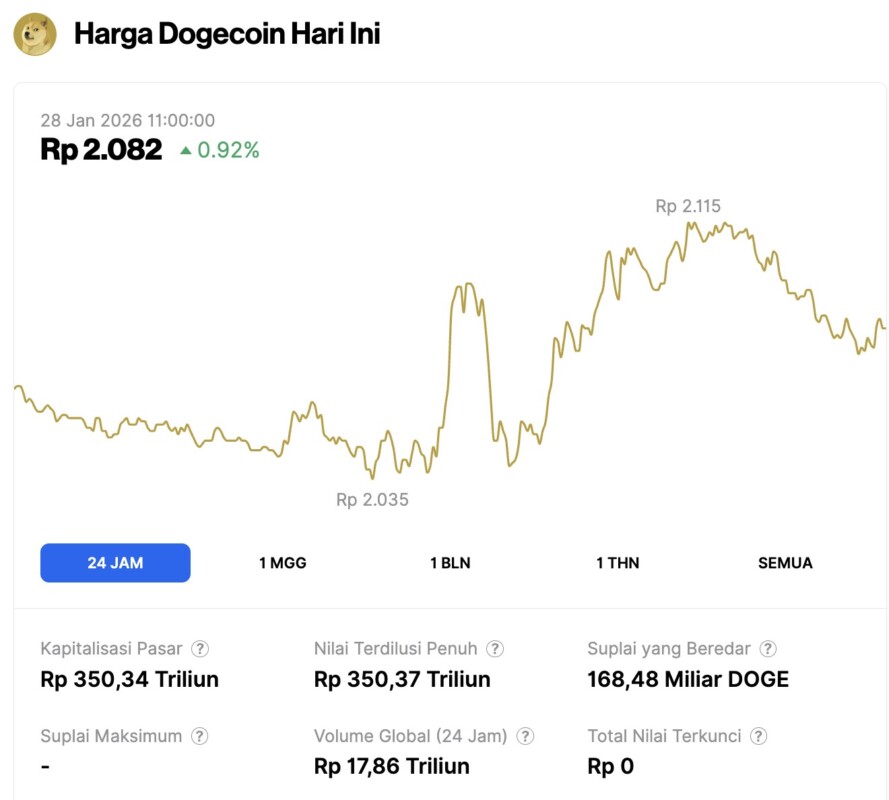 Pada 28 Januari 2026, harga Dogecoin tercatat mengalami kenaikan tipis 0,92% dalam waktu 24 jam, diperdagangkan pada harga $0.1244 atau setara dengan Rp2.082. Dalam periode 24 jam terakhir, harga DOGE bergerak dalam kisaran Rp2.035 hingga ke Rp2.115.