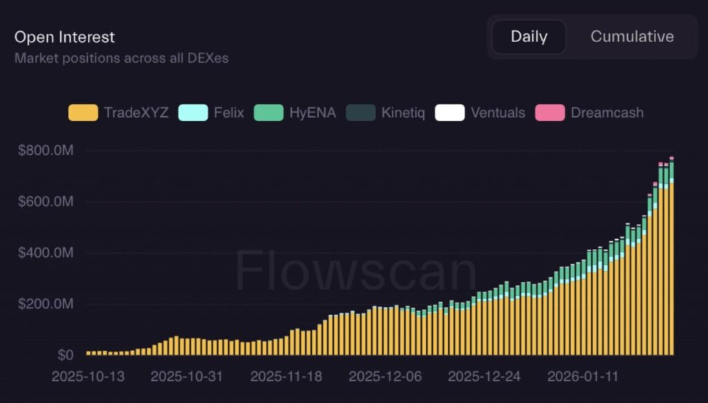 Level perdagangan melonjak drastis hingga mencapai rekor tertinggi sebesar $790 juta. Dalam sebuah unggahan, pihak Hyperliquid menyebut adopsi cepat terhadap HIP-3 sebagai salah satu faktor utama di balik lonjakan ini.