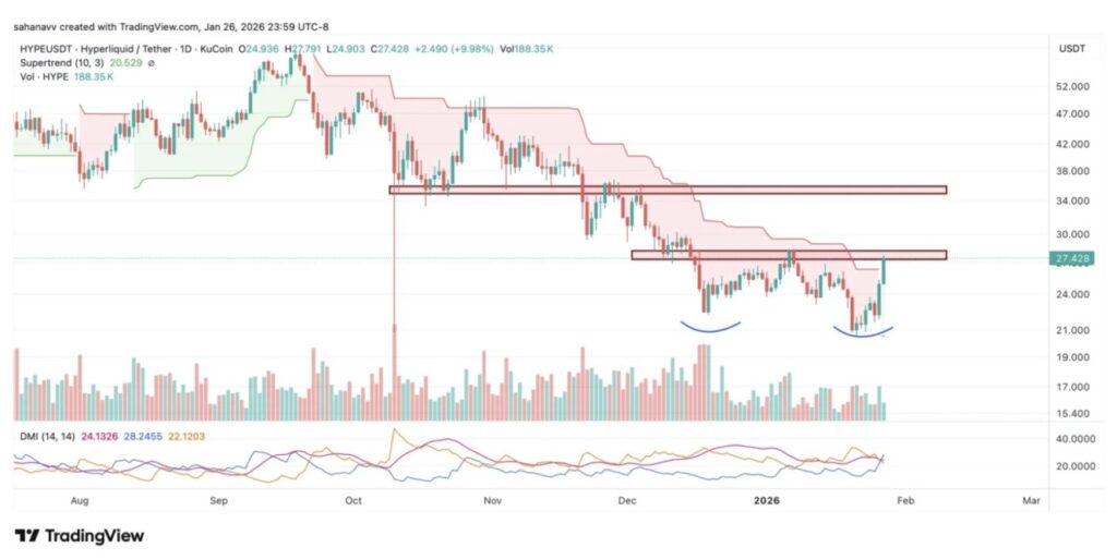 Secara teknikal, HYPE memerlukan beberapa konfirmasi tambahan untuk mendukung potensi kenaikan menuju $50. Saat ini, harga masih berada di bawah zona resistensi penting di sekitar $28 dan $34ā$36, sementara Supertrend tetap bearish, mengindikasikan bahwa tren utama belum berubah.