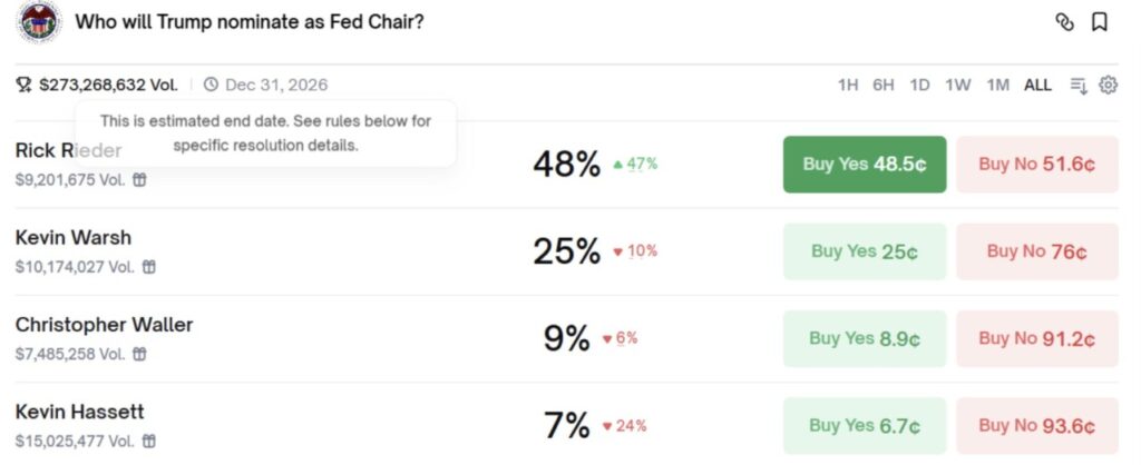 Pasar prediksi menjagokan Rick Rieder dari BlackRock dengan peluang 48% setelah mendapat pujian dari Trump, diikuti Kevin Warsh dengan 25%. Rick Rieder, yang kabarnya menjadi favorit Trump untuk posisi Ketua Fed, menyatakan bahwa suku bunga bisa dipangkas hingga 100 basis poin.