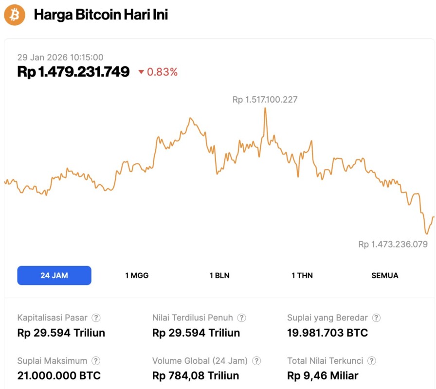 Pada 29 Januari 2026, harga Bitcoin tercatat berada di level $88,042 atau setara dengan Rp1.479.231.749, mengalami koreksi tipis 0,83% dalam 24 jam terakhir. Sepanjang periode ini, BTC menyentuh level terendahnya di Rp1.473.236.079 dan harga tertingginya di Rp1.517.100.227.