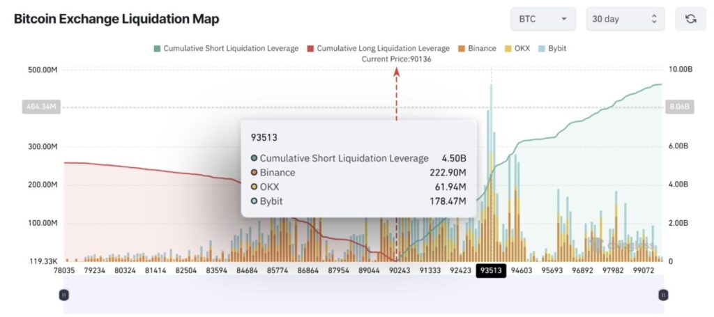 Data dari CoinGlass menunjukkan adanya akumulasi posisi short senilai $4,5 miliar di sekitar level $93.500. Jika Bitcoin menembus kisaran ini, maka likuidasi paksa bisa mempercepat pergerakan harga, mengubah reli lambat menjadi lonjakan cepat yang dipicu oleh penutupan posisi short.