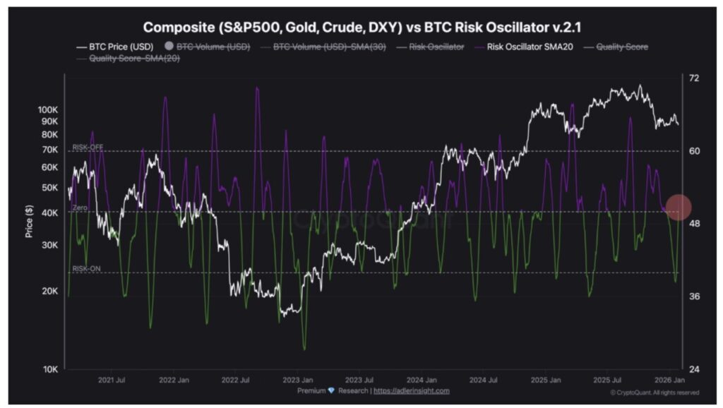 Analis crypto Leo Ruga menyoroti bahwa baik osilator risiko Composite (yang mencakup SPX, emas, minyak mentah, dan DXY) terhadap BTC maupun osilator tekanan onchain saat ini sama-sama berada di wilayah “risk-off”.