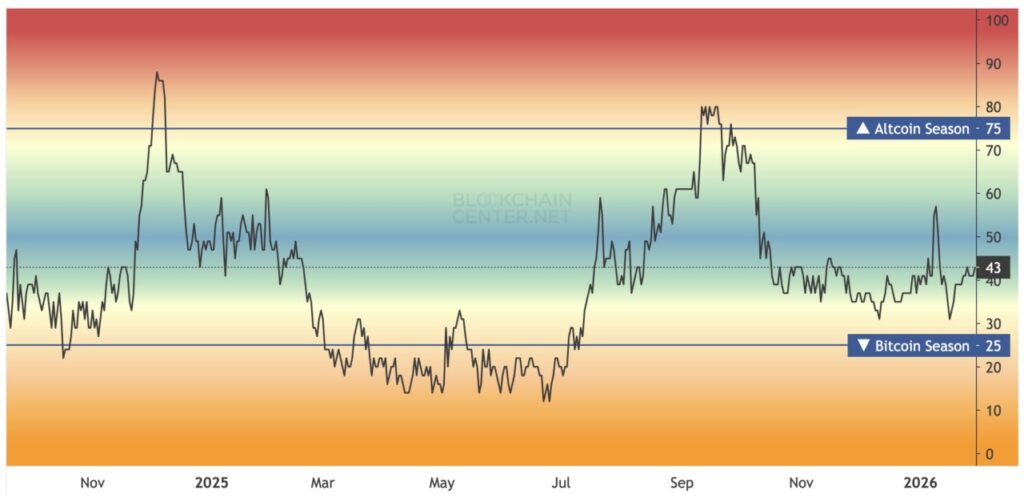 Meskipun sinyal bullish mulai muncul, Indeks Musim Altcoin (Altcoin Season Index) saat ini berada di angka 43, turun 4 poin dalam waktu dekat. Ini menunjukkan bahwa Bitcoin masih mengungguli sebagian besar dari 100 koin teratas selama 90 hari terakhir.