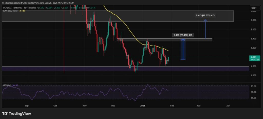 Pada saat laporan dibuat, PENDLE diperdagangkan sekitar USD 1,96, naik sekitar 4,95 % dalam 24 jam terakhir. Volume perdagangan juga meningkat lebih dari 13 %, mencerminkan partisipasi pasar yang lebih tinggi. Volatilitas yang meningkat bersamaan dengan rebound harga bisa menunjukkan minat pasar yang mulai kembali.