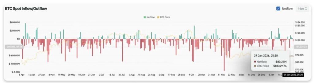Data aliran dari bursa memperkuat sentimen kehati-hatian. Coinglass mencatat aliran keluar bersih sebesar $80,24 juta pada 29 Januari, memperpanjang pola distribusi yang stabil sepanjang Januari.