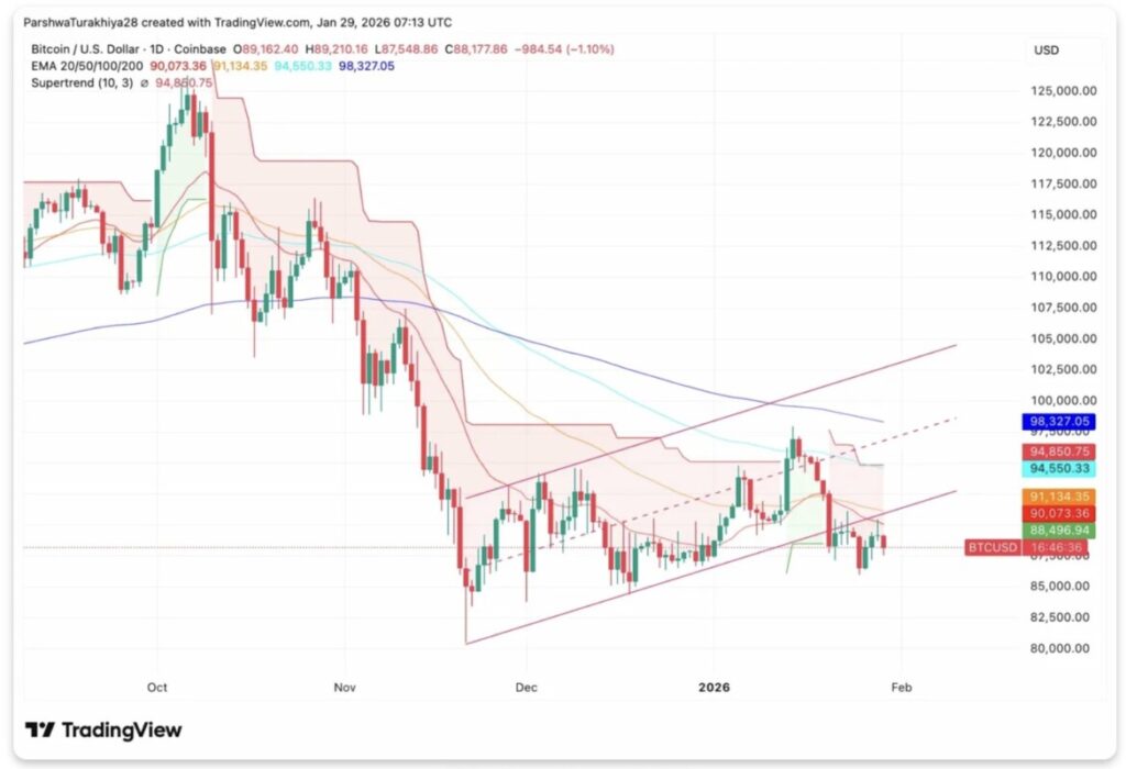 Garis tren naik dari titik terendah Desember di sekitar $85.000 telah menjadi penopang selama Januari. Struktur ini masih bertahan, tetapi kisaran yang makin menyempit antara support garis tren dan resistance EMA menunjukkan bahwa arah pergerakan akan segera ditentukan dalam beberapa sesi ke depan.