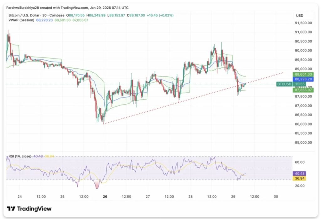 Pada grafik 30 menit, Bitcoin diperdagangkan dekat VWAP sesi di $88.228 setelah turun dari pita atas di $88.601. Indikator RSI berada di 40,48, mencerminkan momentum yang mulai melemah setelah upaya awal sesi menembus $89.000.