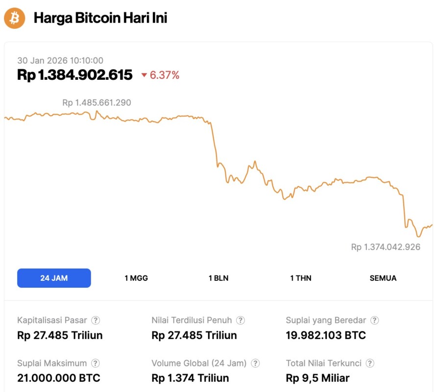 Pada 30 Januari 2026,Ā harga BitcoinĀ tercatat berada di level $82,082 atau setara dengan Rp1.384.902.615, mengalami penurunan 6,37% dalam 24 jam terakhir. Sepanjang periode ini, BTC menyentuh level terendahnya di Rp1.374.042.926 dan harga tertingginya di Rp1.485.661.290.