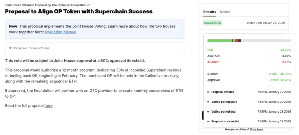 Pemungutan suara ā yang mencapai kuorum pada hari ini, 28 Januari, dengan mayoritas besar pemilih menyatakan setuju, hanya beberapa saat sebelum batas waktu berakhir pada pukul 13:58 ET ā memberikan otorisasi untuk mengalokasikan 50% dari pendapatan sequencer Superchain untuk pembelian token OP setiap bulan.