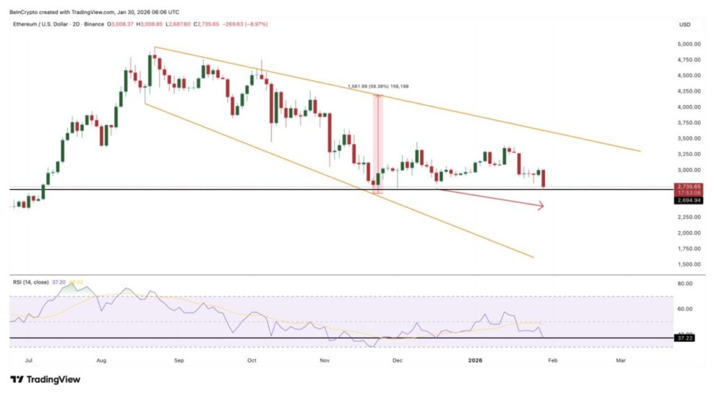 Momentum juga menjadi aspek penting. Antara 17 Desember hingga 29 Januari, Ethereum hampir mencetak harga terendah baru. Namun, di periode yang sama, indikator Relative Strength Index (RSI) bertahan di sekitar level 37. RSI sendiri digunakan untuk mengukur dominasi momentum antara pembeli dan penjual.