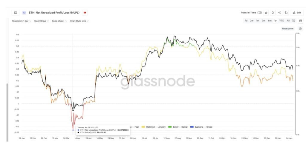 Saat ini, NUPL Ethereum berada di kisaran 0,19, yang menempatkannya di zona ā€œhope–fearā€ (harapan–ketakutan). Level ini penting secara historis. Pada Juni 2025, NUPL turun mendekati 0,17 ketika ETH diperdagangkan di sekitar $2.200. Dalam sebulan setelahnya, harga melonjak ke sekitar $4.800, naik lebih dari 110%.