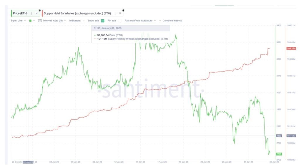 Pemegang besar Ethereum, atau whales, saat ini mengirimkan sinyal yang lebih kuat dibandingkan investor institusional. Data menunjukkan bahwa selama Januari, para whale terus mengakumulasi ETH secara konsisten. Di awal bulan, mereka memegang sekitar 101,18 juta ETH, dan pada akhir bulan, jumlah itu naik menjadi sekitar 105,16 juta ETH.