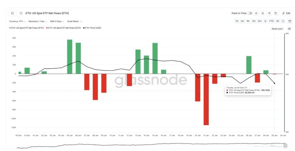 Namun, arus dana dari ETF (Exchange-Traded Funds) justru menunjukkan sikap yang lebih berhati-hati. Meskipun sempat terjadi beberapa hari dengan arus masuk besar, akhir Januari justru disertai outflow besar, dengan penarikan lebih dari 70.000 ETH setara. Artinya, ETF belum benar-benar mendukung skenario rebound.