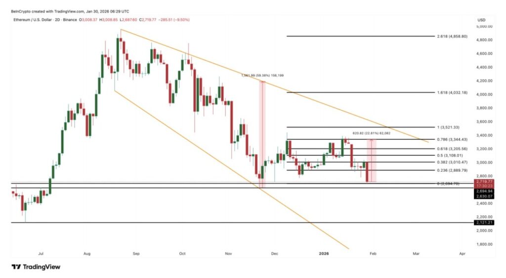 Di sisi atas, Ethereum harus terlebih dahulu merebut kembali level $3.000. Ini adalah hambatan psikologis dan struktural. Harga telah berulang kali gagal menembus level ini sejak Desember.