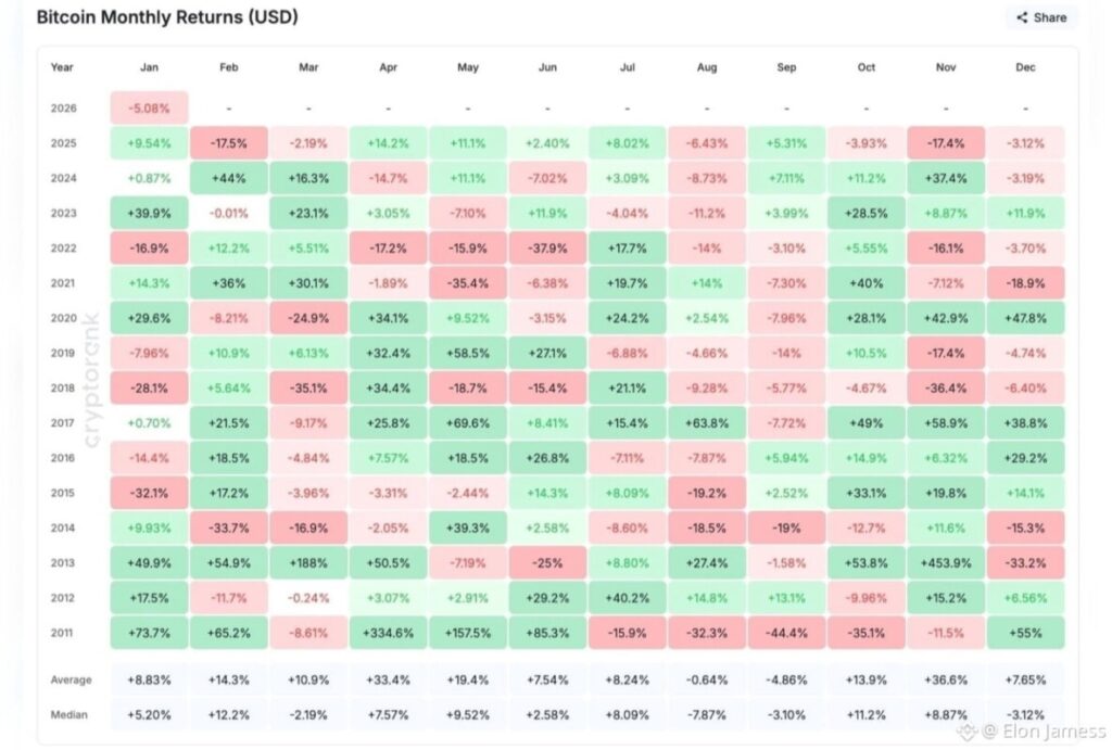 Data historis dari lebih dari 13 tahun menunjukkan bahwa Februari lebih sering mencatat kenaikan harga Bitcoin dibandingkan bulan lainnya. Dalam periode tersebut, 9 dari 13 kali Bitcoin mencatat return positif di bulan Februari, meskipun Januari mengalami koreksi. Rata-rata gain Bitcoin di bulan ini berada di kisaran 14,3 %, sementara median return sekitar 12,2 %. Pola ini mengindikasikan bahwa koreksi awal tahun tidak selalu berlanjut menjadi tren turun panjang.