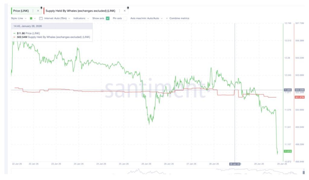 Perubahan sentimen ini sejalan dengan perilaku whale baru-baru ini. Sejak 28 Januari, kepemilikan whale menurun dari 502,53 juta LINK menjadi 501,97 juta LINK—penurunan sekitar 560.000 token.