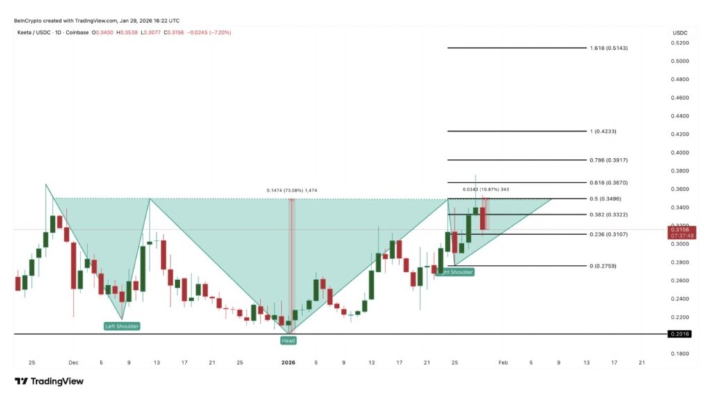 Dari sisi teknikal, grafik harga KTA saat ini cenderung mendukung pandangan mega whale. Keeta sedang membentuk pola inverse head and shoulders, sebuah struktur yang sering muncul sebelum pergerakan naik lanjutan. Garis leher (neckline) berada di sekitar $0,34, sementara harga saat ini berada di kisaran $0,30—artinya pemicu breakout ada sekitar 10% di atas harga sekarang.