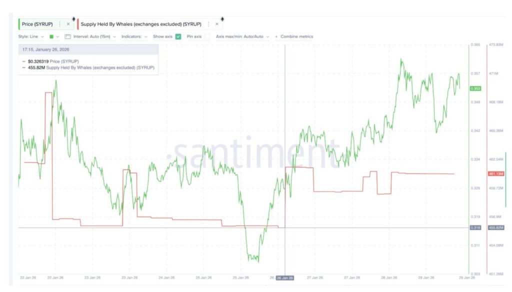 Whale terlihat terus mengakumulasi SYRUP meskipun harga sempat mengalami koreksi jangka pendek. Pada 26 Januari, kepemilikan whale tercatat sebesar 455,82 juta SYRUP. Hingga 29 Januari, jumlah tersebut meningkat menjadi 461,13 juta. Menariknya, akumulasi kembali berlanjut dalam 24 jam terakhir setelah sempat jeda singkat, menunjukkan keyakinan berkelanjutan dan bukan sekadar aksi beli sesaat.