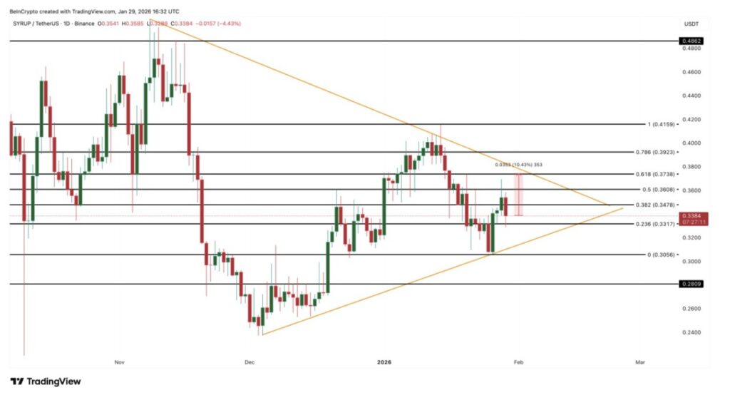 Struktur harga mendukung pola ini. Sejak awal November, SYRUP telah bergerak dalam pola segitiga simetris, yang mencerminkan ketegangan antara pembeli dan penjual dalam jangka menengah.