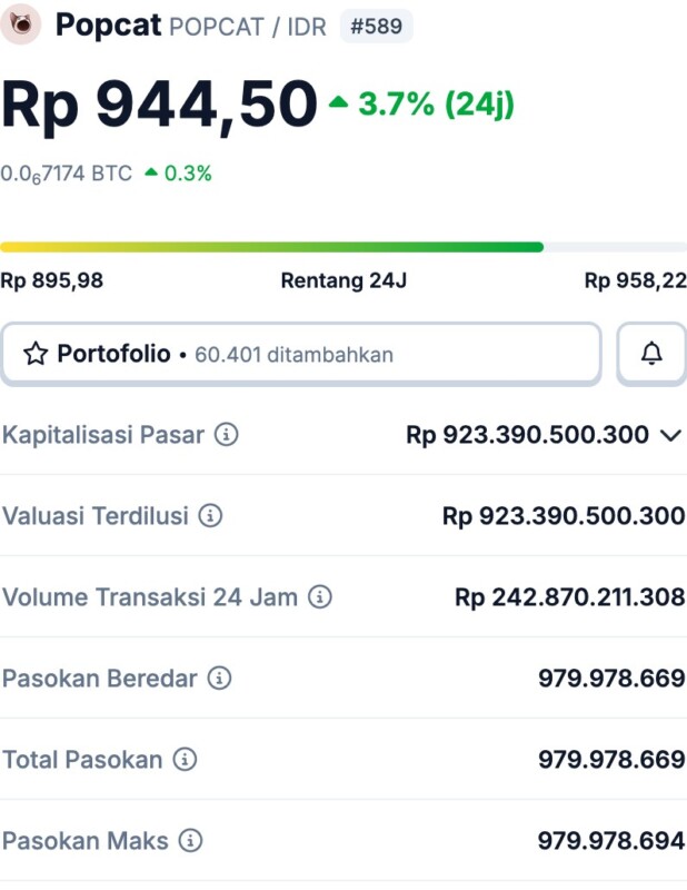 Dalam 24 jam terakhir, volume perdagangan Popcat menunjukkan nilai yang signifikan di beberapa bursa crypto. Aktivitas pasar ini mencerminkan bahwa masih ada minat trader dalam membeli dan menjual token ini meskipun termasuk aset berisiko tinggi.