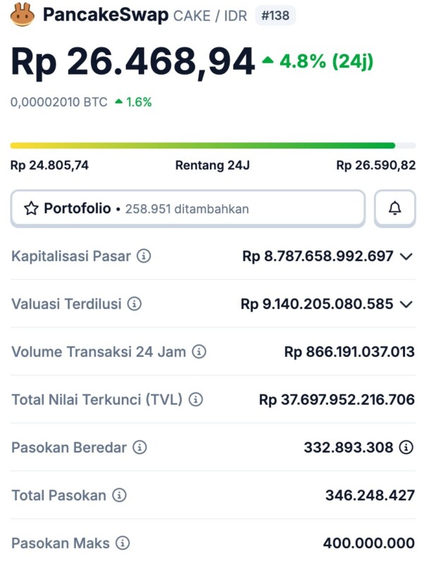 PancakeSwap (CAKE) memiliki kapitalisasi pasar yang mencapai triliunan Rupiah, menempatkan token ini sebagai salah satu aset DeFi dengan kapitalisasi menengah di pasar crypto global. Kapitalisasi ini mencerminkan total nilai semua token CAKE yang beredar di pasar.