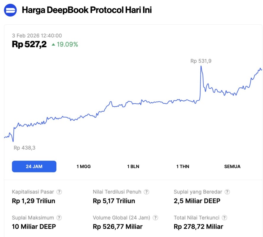 Harga DeepBook Protocol mencatatkan kenaikan yang solid dalam 24 jam terakhir, naik sebesar 19,09% dan saat ini berada di level Rp527,2. Sepanjang periode tersebut, harga terendah tercatat di Rp438,3, sementara harga tertingginya menyentuh Rp531,9 sebelum kembali terkonsolidasi di dekat level saat ini.