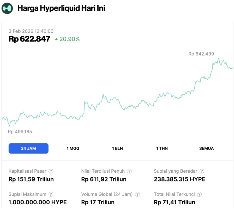 Harga Hyperliquid mengalami kenaikan signifikan dalam 24 jam terakhir, naik sebesar 20,90% dan saat ini diperdagangkan di level Rp622.847. Sepanjang periode tersebut, harga terendah tercatat di Rp499.185, sementara harga tertingginya menyentuh Rp642.439, menandakan tren naik yang cukup kuat.