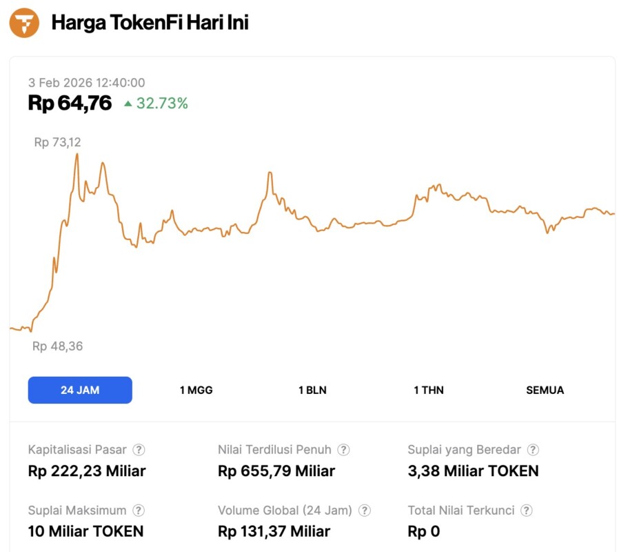 Harga TokenFi mencatatkan kenaikan signifikan dalam 24 jam terakhir, dengan lonjakan sebesar 32,73% dan kini diperdagangkan di level Rp 64,76 pada 3 Februari. Dalam periode tersebut, harga terendah berada di Rp48,36, sementara harga tertinggi sempat menyentuh Rp73,12 sebelum mengalami sedikit koreksi.