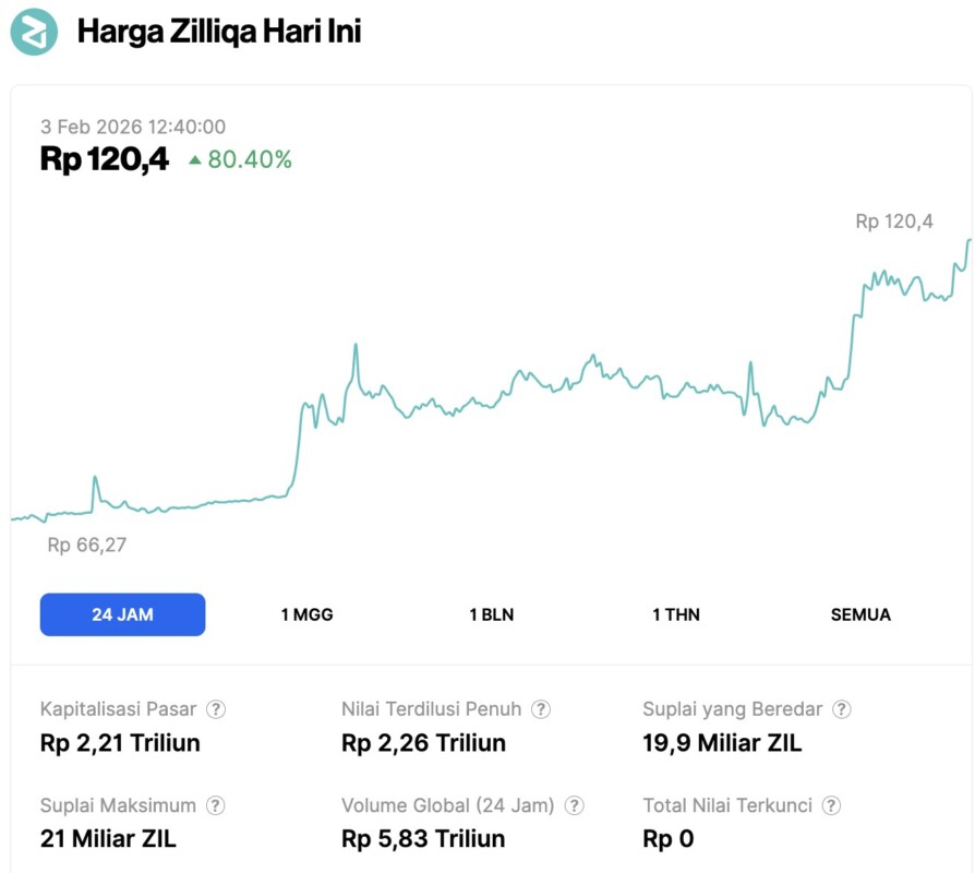 Lonjakan harga ini turut mendorong kapitalisasi pasar Zilliqa mencapai Rp2,21 triliun, dengan nilai terdilusi penuh sebesar Rp2,26 triliun. Aktivitas perdagangan pun meningkat drastis, tercermin dari volume perdagangan global dalam 24 jam terakhir yang mencapai Rp5,83 triliun.