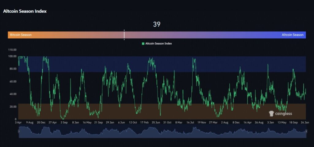 Salah satu indikator yang sering digunakan untuk mengukur altseason adalah Altcoin Season Index, yang menunjukkan persentase momentum pasar yang berada di luar Bitcoin. Pada awal Februari 2026, indeks ini tercatat di angka 39, jauh di bawah ambang yang biasa diasosiasikan dengan altseason (biasanya di atas 50ā60).