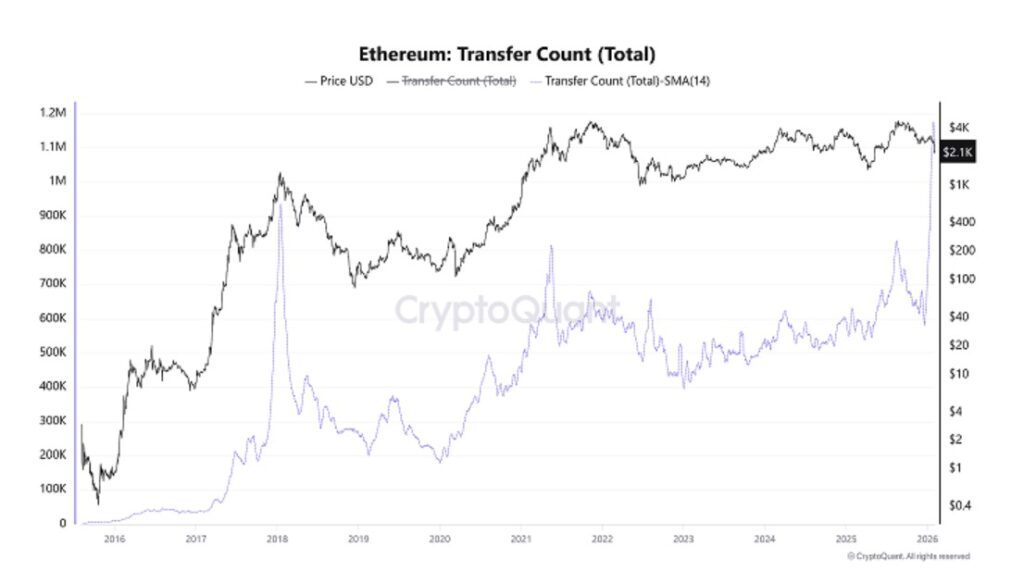 Jakarta, Pintu News – Harga Ethereum saat ini berada di bawah tekanan seiring munculnya sinyal sensitif dari data on-chain. Pada akhir Januari, jumlah total transfer Ethereum—yang dirata-ratakan menggunakan Simple Moving Average (SMA) 14 hari—melonjak tajam hingga mencapai 1,17 juta.