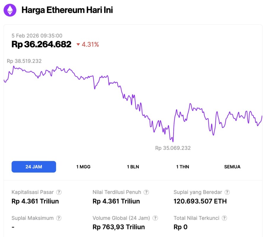 Pada 5 Februari 2026, harga Ethereum tercatat berada di sekitar $2,149 atau setara dengan Rp36.264.682, mengalami penurunan 4,31% dalam 24 jam terakhir. Sepanjang periode ini, ETH sempat menyentuh level terendahnya di Rp35.069.232 dan level tertingginya di Rp38.519.232.
