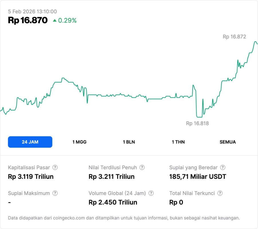 Volume perdagangan USDT dalam 24 jam terakhir menunjukkan likuiditas yang sangat tinggi, yang merupakan karakter penting dari stablecoin utama di pasar crypto. Nilai kapitalisasi pasar USDT juga mencapai triliunan rupiah, mencerminkan peran besar aset ini dalam sistem perdagangan aset digital global.