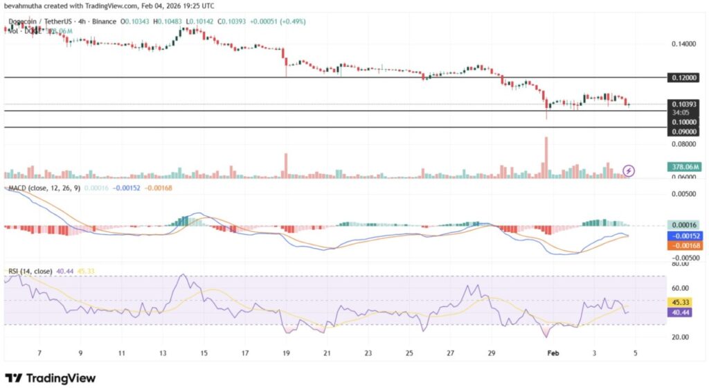 Harga terbaru Dogecoin anjlok ke $0,10379 pada 4 Februari 2026, mencatat penurunan sebesar 0,36% dalam 24 jam. Saat ini, area support utama berada di kisaran $0,10. Jika harga DOGE tetap berada di bawah level ini, kemungkinan besar akan menguji support berikutnya di $0,09.