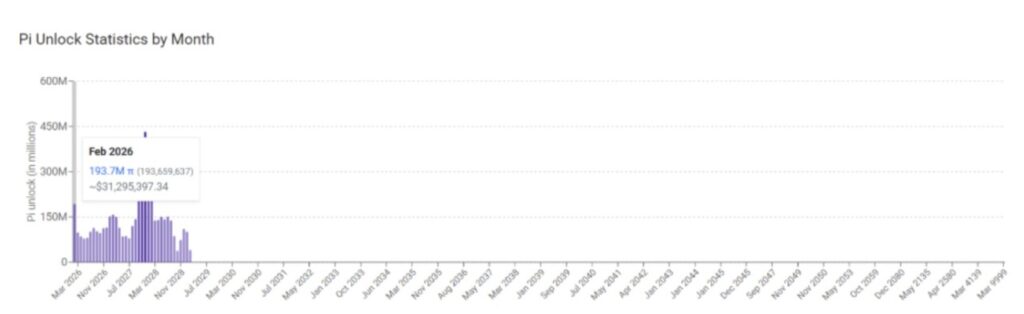 Data dari Piscan menunjukkan bahwa lebih dari 193 juta token Pi akan terbuka (unlock) selama bulan Februari, dengan nilai lebih dari $31 juta. Ini merupakan jumlah unlock terbesar yang dijadwalkan dari sekarang hingga Oktober 2027.