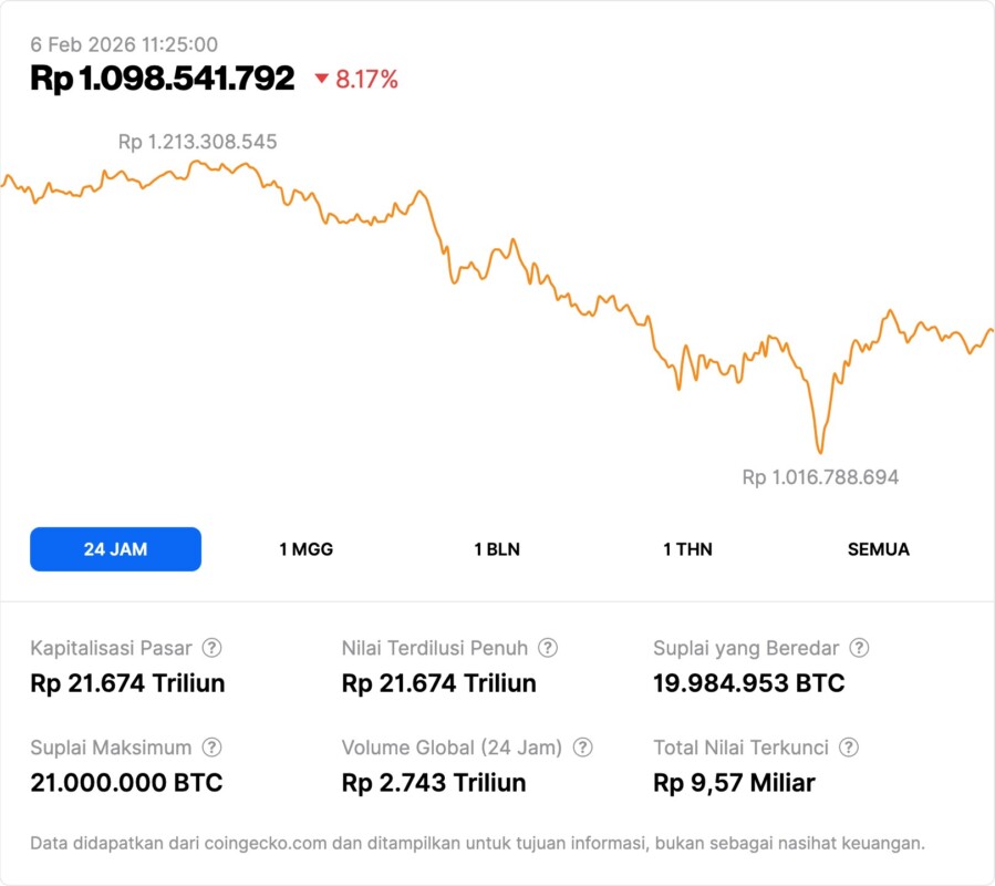 Harga Bitcoin turun drastis ke level terendah sejak Oktober 2024, mencapai kurang dari US$66.000 per unit dalam beberapa sesi perdagangan terakhir. Penurunan ini terjadi setelah aset teknologi global mengalami aksi jual besar yang meluas ke pasar berisiko termasuk kripto. Sejak puncak historisnya sekitar US$126.000 pada Oktober 2025, BTC kini turun hampir 50 persen dari nilainya. Penurunan harga yang kuat seperti ini menunjukkan volatilitas tinggi yang menjadi karakter pasar aset kripto.
