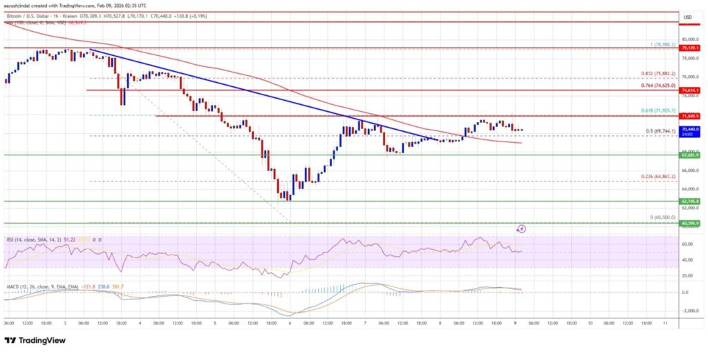 Bitcoin saat ini diperdagangkan stabil di atas USD70.000 atau sekitar Rp1,18 miliar. Harga ini bertahan setelah pemulihan dari level terendah di kisaran USD60.500.