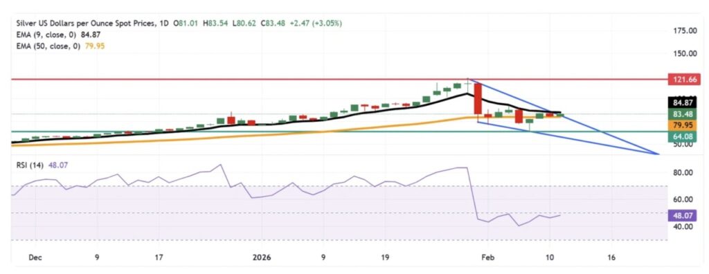 Di sisi atas, resisten terdekat berada di batas atas pola descending wedge di sekitar $84,50, kemudian diikuti zona EMA 9 hari di sekitar $84,66. Penutupan harga di atas rerata jangka pendek tersebut akan meredakan tekanan dalam jangka pendek dan membuka peluang bagi harga perak untuk kembali menguji area sekitar rekor tertinggi $121,66 yang terbentuk pada 29 Januari.